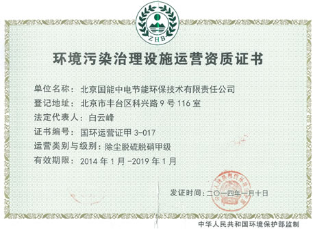 當前位置: 國能中電公司動態(tài)> 我司喜獲環(huán)保部《環(huán)境污染治理設施運營資質(zhì)甲級證書》