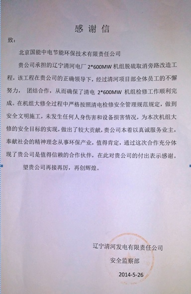 在公司總部的正確領(lǐng)導(dǎo)下,經(jīng)過(guò)遼寧清河電廠2*600MW機(jī)組脫硫取消旁路改造工程項(xiàng)目部全體員工的共同努力,確保了該工程業(yè)主安全目標(biāo)的順利實(shí)現(xiàn),受到業(yè)主公司安全監(jiān)察部表?yè)P(yáng),也充分體現(xiàn)了我們國(guó)能中電是值得信賴的合作伙伴。