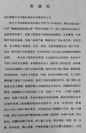 當前位置: 國能中電公司動態(tài)> 公司遼寧華電鐵嶺EPC項目受業(yè)主表揚