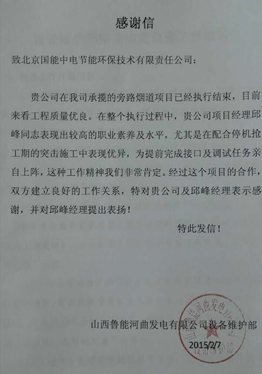 當(dāng)前位置: 國能中電公司動態(tài)> 山西河曲EPC項目受業(yè)主贊譽