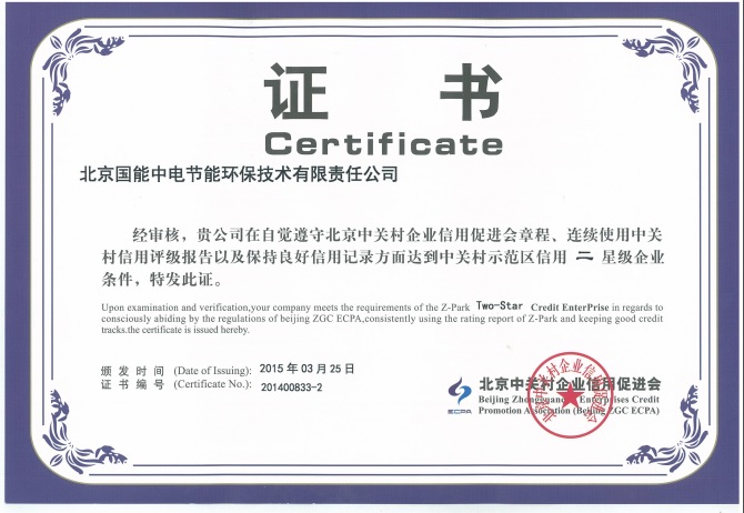 熱烈祝賀我公司榮獲“中關(guān)村示范區(qū)信用二星級企業(yè)證書”。國能中電已連續(xù)一年保持升級,證明國能中電在信用度方面贏得中關(guān)村管委會及中國人民銀行的認可,企業(yè)融資能力不斷攀升,我公司可享受比例為25%的企業(yè)貸款貼息。