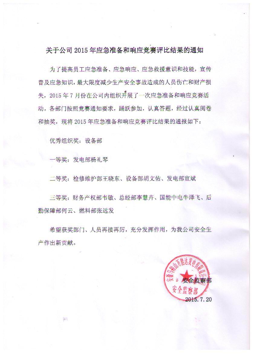 為了提高員工應(yīng)急準(zhǔn)備、應(yīng)急響應(yīng)、應(yīng)急救援意識(shí)和技能,宣傳普及應(yīng)急知識(shí),馬鞍山項(xiàng)目部業(yè)主萬(wàn)能達(dá)電廠(chǎng)于2015年7月組織開(kāi)展了應(yīng)急競(jìng)賽,我公司牛澤飛獲得三等獎(jiǎng),牛澤飛是獲得獎(jiǎng)項(xiàng)的唯一非電廠(chǎng)員工,牛澤飛的獲獎(jiǎng)及展示了公司風(fēng)貌,又體現(xiàn)項(xiàng)目的安全教育頗有成效,既了強(qiáng)化了員工的安全意識(shí),也提高了員工處理應(yīng)急突發(fā)情況的能力。