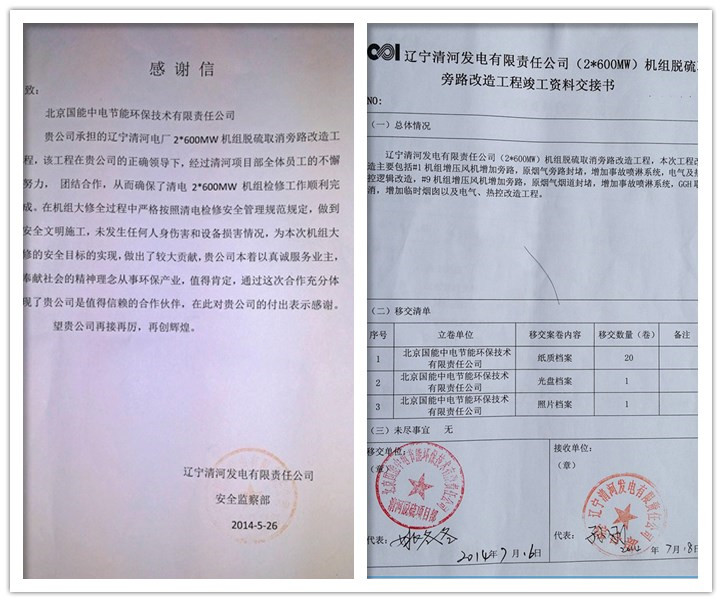 在公司總部的正確領(lǐng)導下,經(jīng)過清河EPC旁路改造項目部全體成員的共同努力,7月18日,遼寧清河發(fā)電有限責任公司業(yè)主代表在竣工資料交接證書上簽字,標志著我公司承擔的遼寧清河電廠2*600MW機組脫硫取消旁路改造工程正式竣工驗收,成功打響了我司在中國電力投資集團的第一槍。
